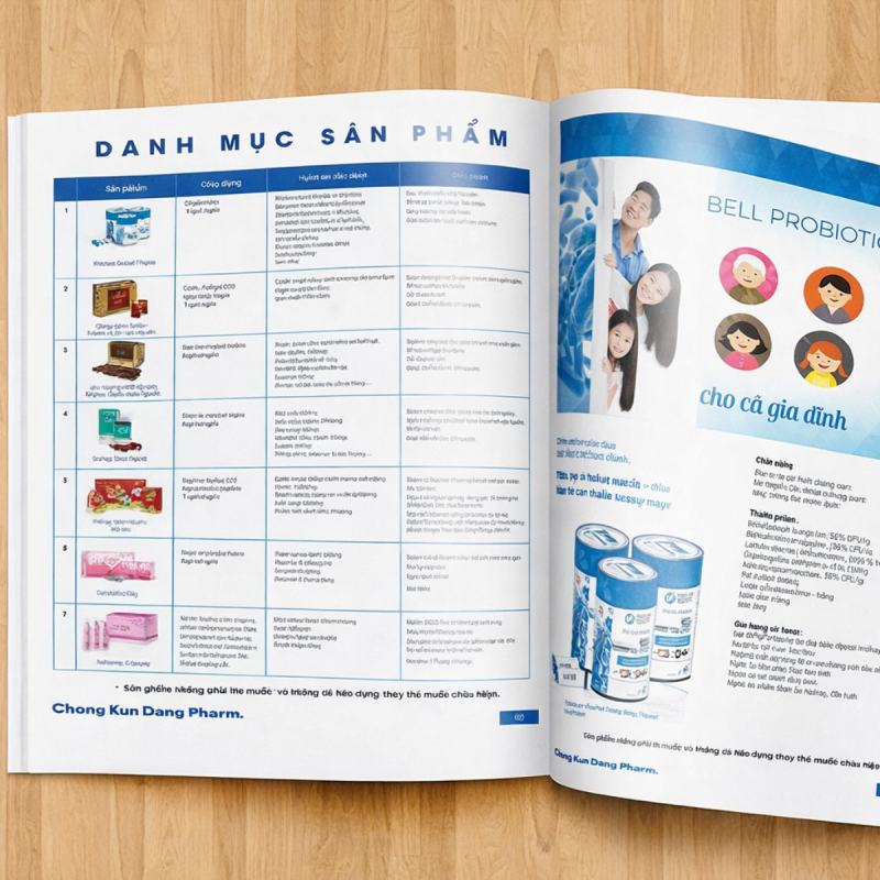 Thiết kế & in ấn: Thiết kế tuân thủ quy định ngành dược, thể hiện tính khoa học và chuyên nghiệp. Có thể in dạng catalogue đóng gáy keo, lò xo hoặc gập giữa tùy theo nhu cầu sử dụng.