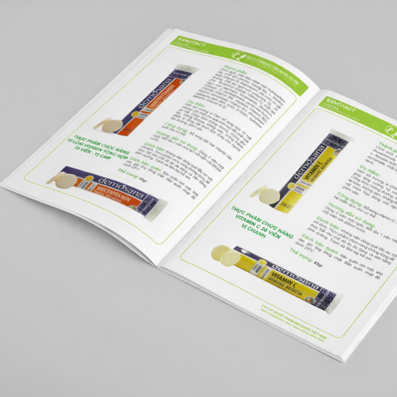 Thiết kế & in ấn: Thiết kế tuân thủ quy định ngành dược, thể hiện tính khoa học và chuyên nghiệp. Có thể in dạng catalogue đóng gáy keo, lò xo hoặc gập giữa tùy theo nhu cầu sử dụng.