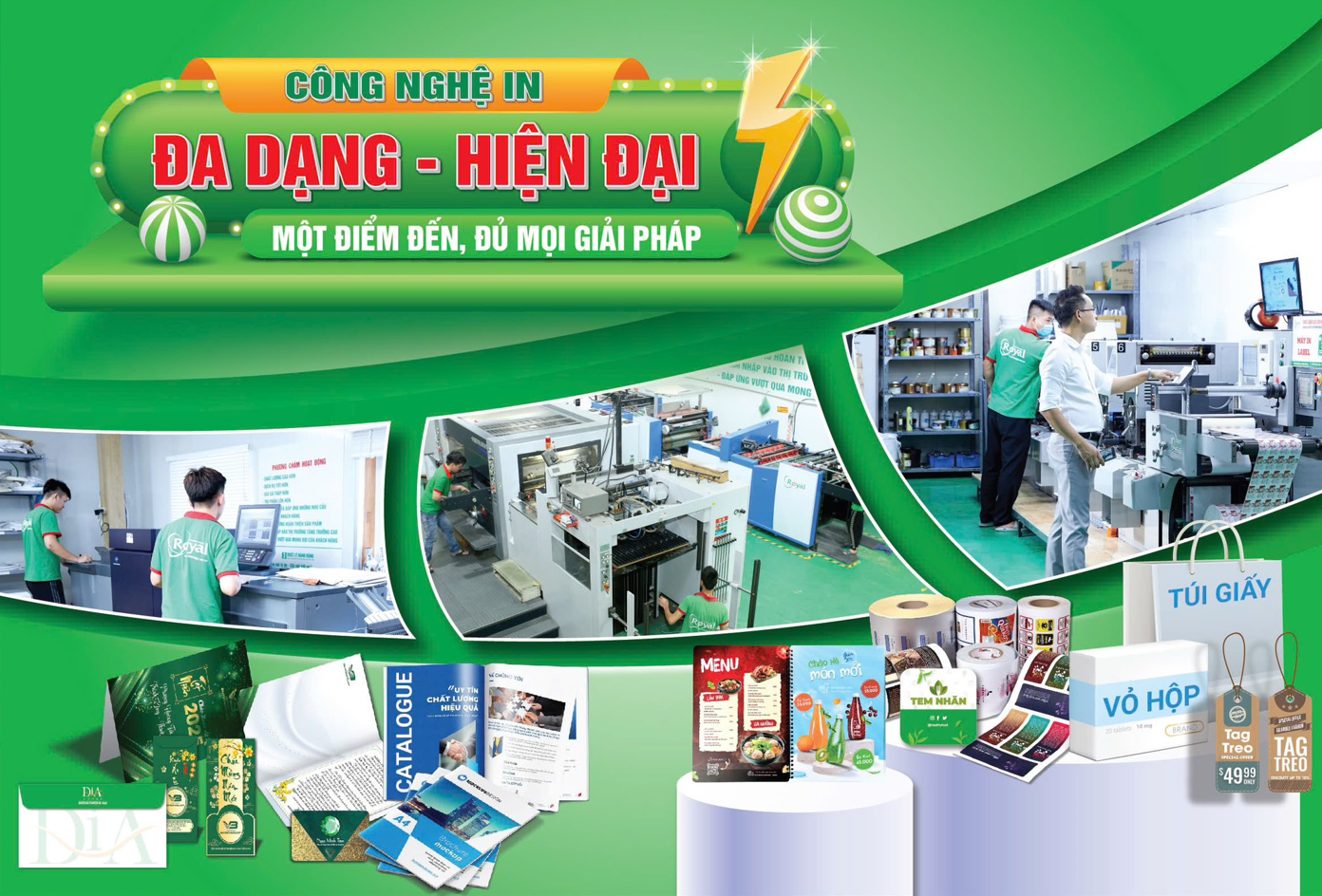 Royal sử dụng hệ thống máy in offset Mitsubishi Daiya nhập khẩu từ Nhật Bản, kết hợp với in UV và kỹ thuật số.